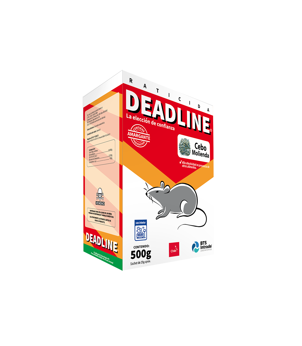 Rodenticida monodósico de segunda generación, formulado en base a granos y cereales para el control de todas las especies de roedores de importancia en Salud Pública. Raticida de máxima palatabilidad, logrando competir con alimento de animales y granos almacenados.