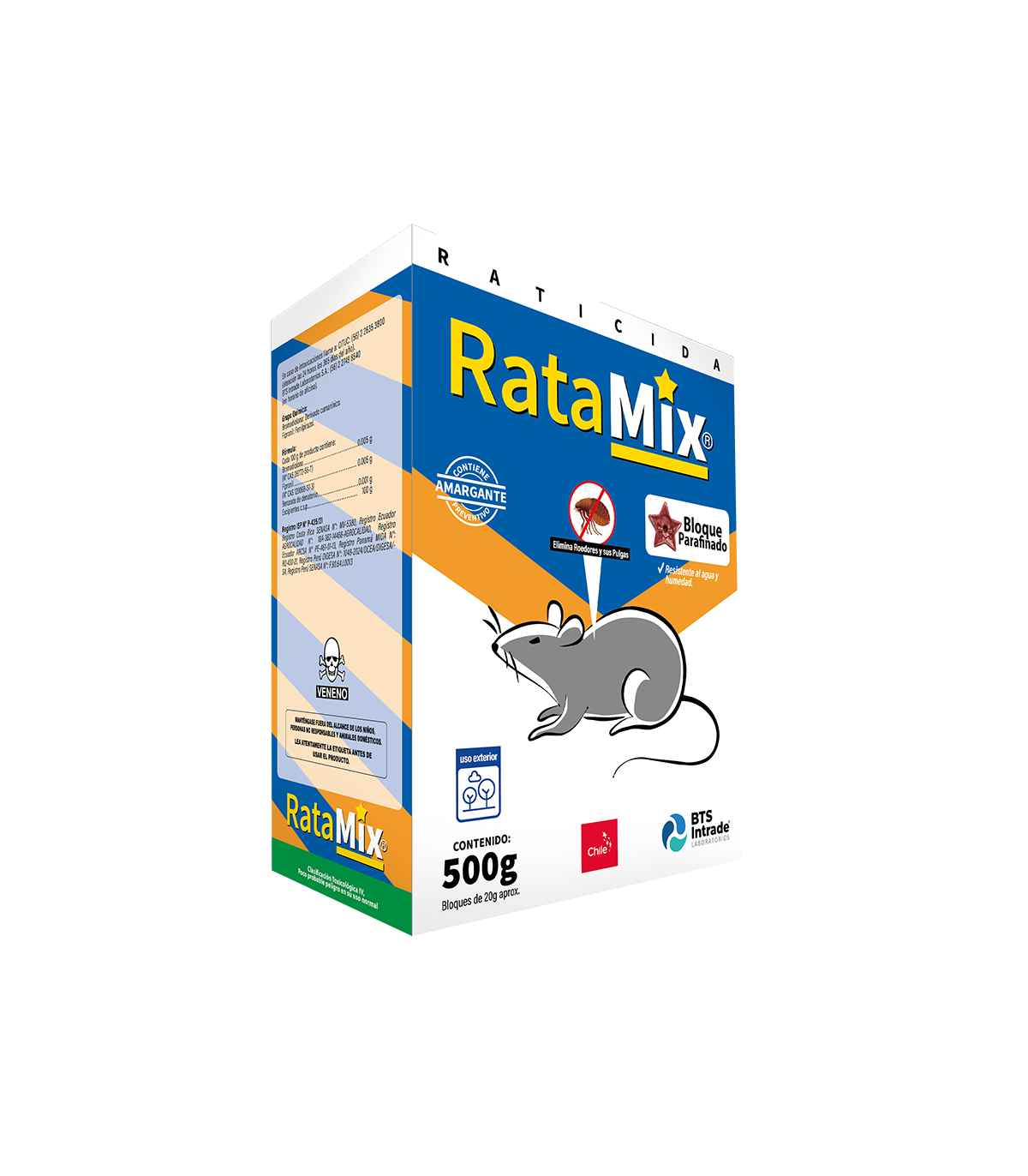 Único rodenticida en Chile que controla a los roedores y a los ectoparásitos presentes en ellos, como pulgas, garrapatas, piojos, entre otros. Gracias a su original formulación que posee un rodenticida (Bromadiolona) y un insecticida (Fipronil). Eliminando 2 vectores con una sola aplicación solucionando de manera eficiente estos problemas de Sanidad Ambiental. Formulado en un mayor porcentaje de parafina, recomendando para lugares lluviosos o de alta humedad.