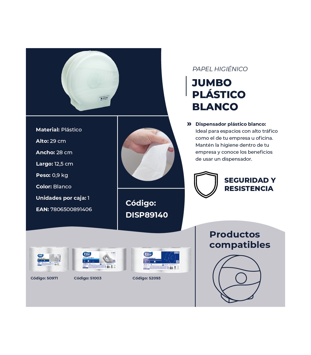 Dispensadores de Papel Higiénico Jumbo Plástico Blanco de Elite, brinda calidad y comodidad. Cuenta con un diseño elegante y moderno, y permite mantener la higiene dentro del establecimiento.