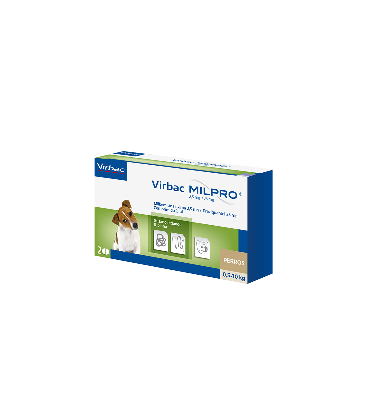 MilPro 2,5mg/25mg es un antiparasitario interno para cachorros y razas pequeñas que ayuda en la prevención y tratamiento de infestación endoparasitaria mixta de cestodos (Dipylidium caninum, Taenia spp., y Echinococcus spp.)y nematodos (Ancylostoma caninum, Toxocara canis, Toxascaris leonina y Trichuris vulpis), en cachorros y razas pequeñas entre 0,5 y 10 kg de peso.Virbac MilPro 2,5/25mg ha sido dosificado especialmente para cachorros y razas pequeñas entre 0,5 y 10 kgs de peso.