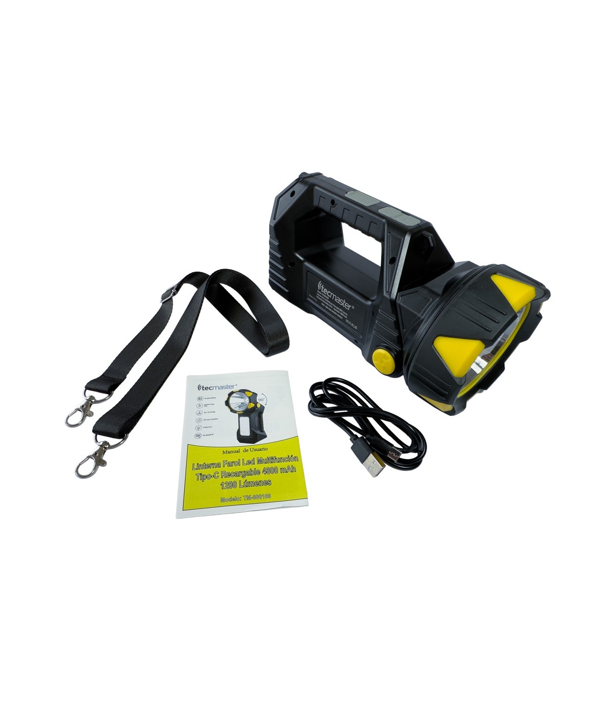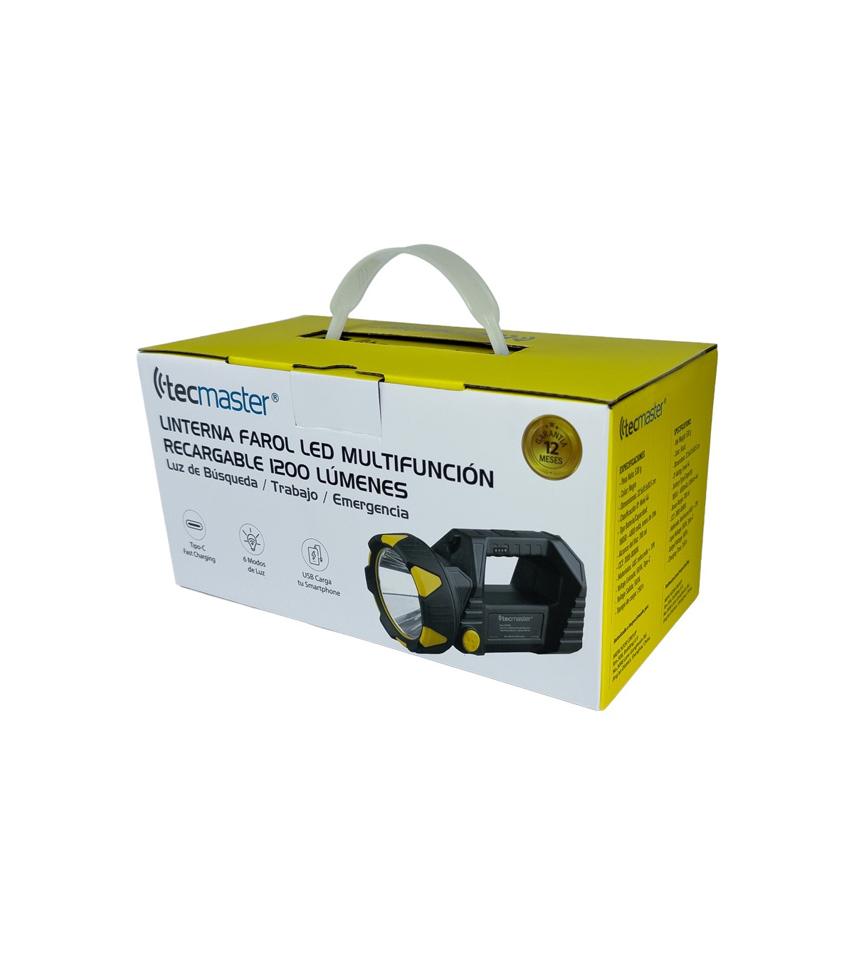 | Multifuncional como iluminación y fuente de alimentación. 7 modos de iluminación. Iluminación ultra-alta de hasta 1000 lúmenes que alcanza un rango de haz de 480 metros. Correa de hombro ajustable y asa ergonómica. - Fuente de alimentación: paquete de batería de litio de 3,7 V, 4800 mAh (incorporado) - Fuente de iluminación: 10W LED + 104X SMD - Entrada: 5V 1A. Salida: 5V 1A - Tiempo de carga: 8 horas (aprox.) - Distancia del haz: 480m - Temperatura de color correlacionada (CCT): 5500K-7000K - Dimensiones: 200 x 107 x 146 mm - Peso neto: 545±10 g |