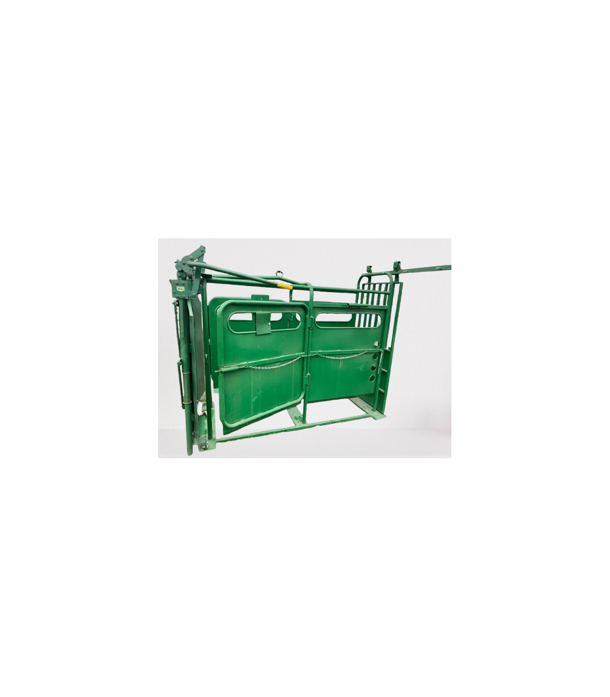 Brete metálico para bovinos que incluye tijera bilateral en la cabecera, puerta corredera en la parte posterior y dos puertas laterales.