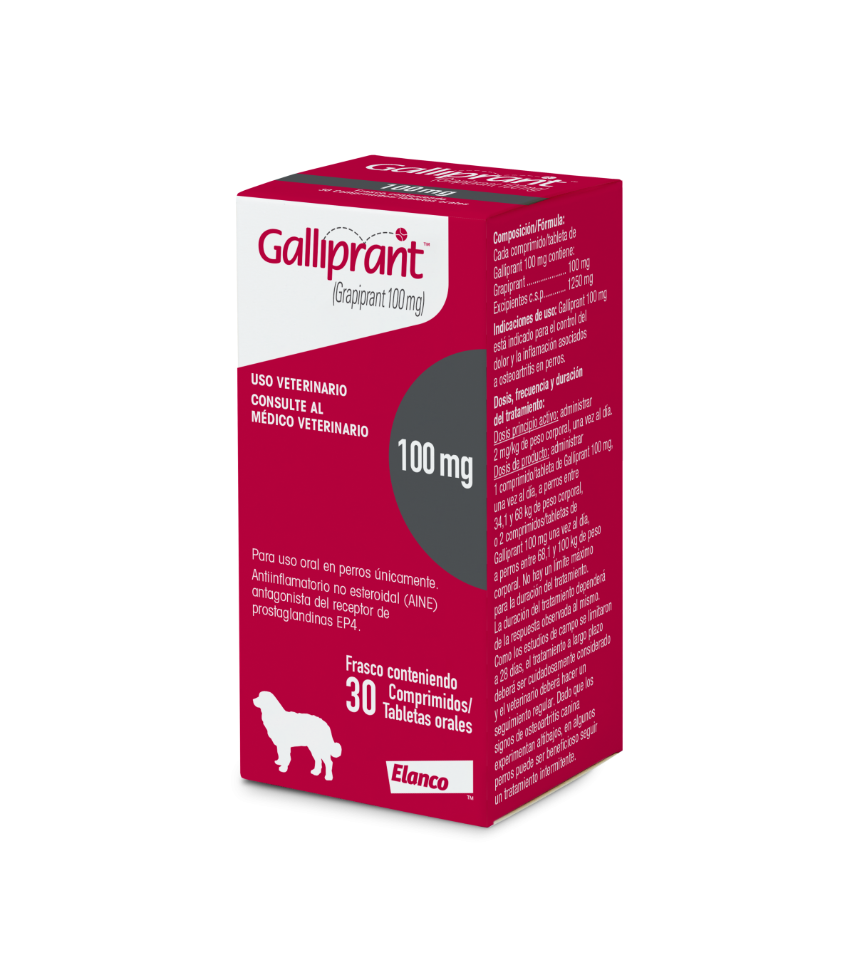 Galliprant 100 mg es indicado para el control del dolor y la inflación asociados a osteoartritis en perros.
