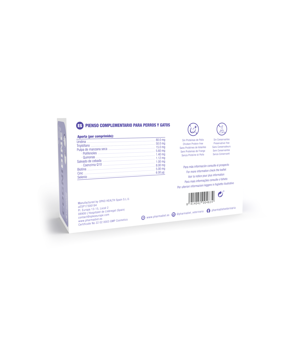 Alimento complementario que ayuda en el tratamiento de los transtornos asociados con el deterioro del sistema cognitivo en perros y gatos gracias a la acción conjunta de compuestos neuroregenerativos, neuroprotectores, antioxidantes y reguladores de la ansiedad y de los trastornos del sueño.