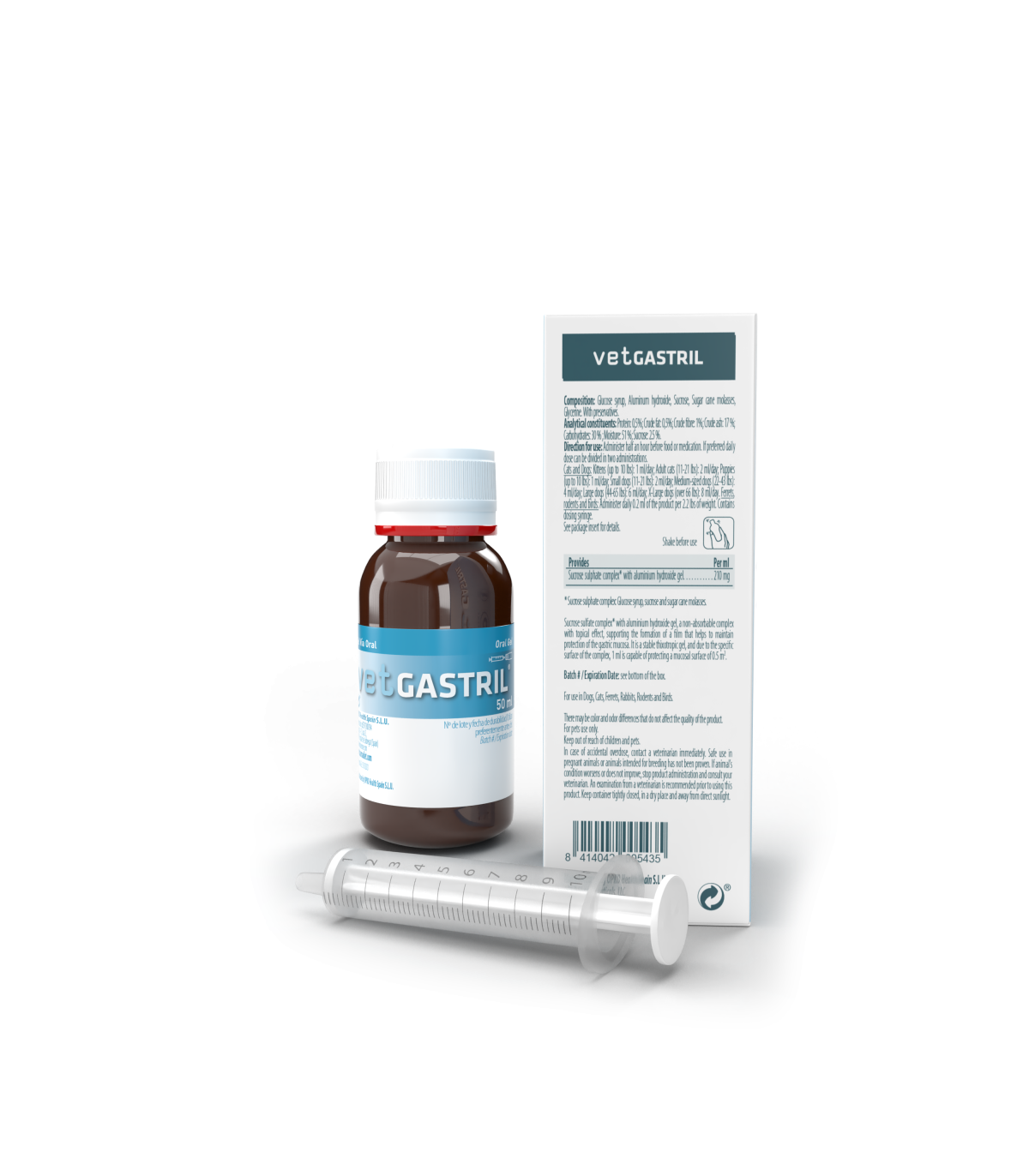 Vetgastril Plus aporta nutrientes que contribuyen a fortalecer y proteger la mucosa gástrica y esofágica, favorece la digestión y absorción de nutrientes, previniendo problemas como vómitos, diarrea y pérdida de apetito.