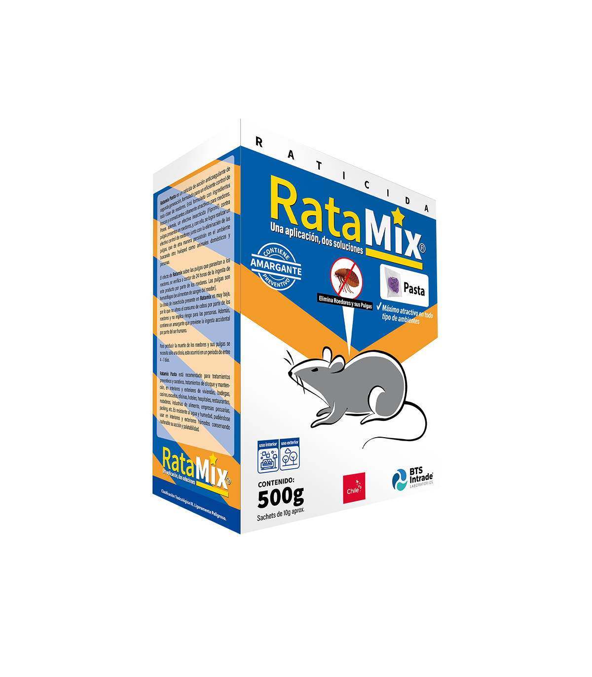 Único rodenticida en Chile que controla a los roedores y a los ectoparásitos presentes en ellos, como pulgas, garrapatas, piojos, entre otros. Gracias a su original formulación que posee un rodenticida (Bromadiolona) y un insecticida (Fipronil). Eliminando 2 vectores con una sola aplicación solucionando de manera eficiente estos problemas de Sanidad Ambiental. Formulado como pasta para lugares con poca presencia de agua y humedad.